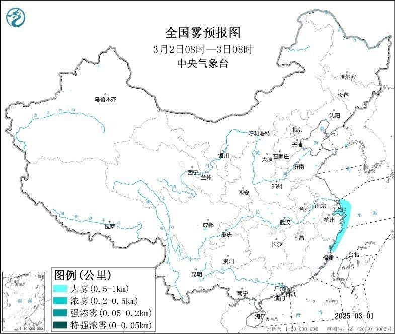 中央气象台3月2日6时继续发布大雾黄色预警:预计,3月2日白天至夜间,长江口及杭州湾附近海域、舟山群岛附近海域、浙江沿岸海域、上海港、宁波港将有能见度不足1公里的浓雾。