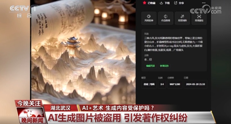 武汉东湖新技术开发区人民法院东湖科学城人民法庭二级法官 许冬冬: 首先应当看原告王某输入的关键词及参数是否达到了独创性的标准;第二个是原告的创作活动和生成作品的关联性,原告在创作的时候输入了几十个关键词,比如卷轴、光影效果、远景等等,经过了几十次输出并且挑选筛选,最终获得了涉案图片。
