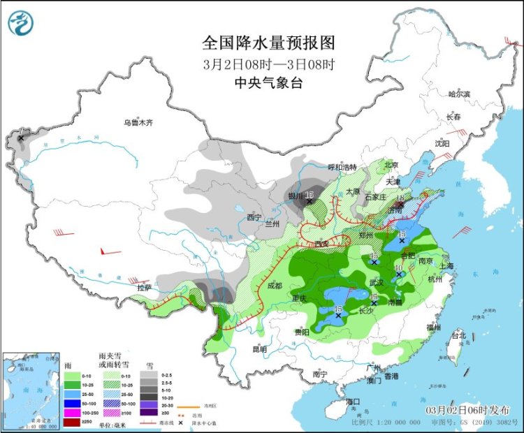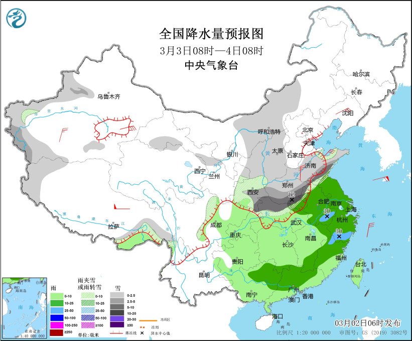 雨雪方面,预计2日至3日,西北地区东部、华北西部和南部、黄淮、江汉等地有小雨转雨夹雪或中到大雪,陕西、河南、山东、湖北北部等地部分地区有暴雪;上述部分地区新增积雪深度4~8厘米,局地10厘米以上。此外,黄淮、江汉、江淮、江南西部和北部等地部分地区有大雨,局地暴雨,并伴有雷暴大风或冰雹等强对流天气。
