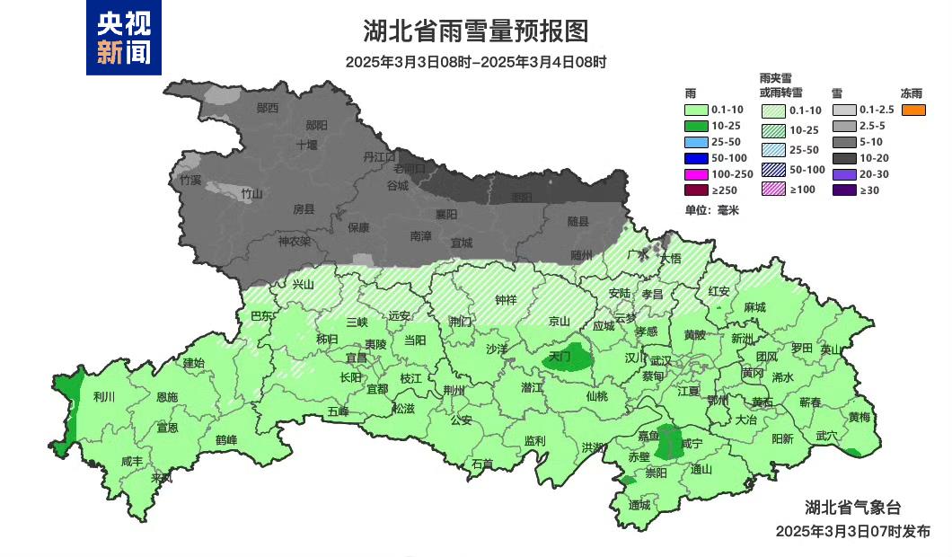 记者从湖北省气象局获悉,今天(3日)凌晨,神农架、十堰、襄阳西部、宜昌北部等地的高山区出现雨夹雪和雪。昨天(2日),十堰、恩施、咸宁、鄂州等地出现中到大雨并伴有雷电,其中17个县市区39个乡镇出现暴雨,鄂州梁子湖区、咸宁赤壁局地出现小冰雹。