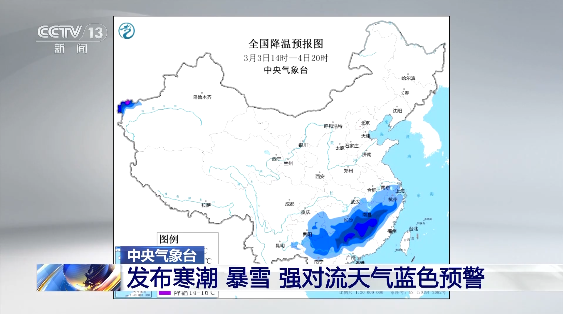 中央气象台上午10时继续发布寒潮、暴雪、强对流天气蓝色预警:预计今天14时至明天晚上8时,江淮西部、江南大部、华南北部、西南地区东南部等地将降温6~8℃,其中,江南南部等地部分地区降温可达10℃以上。