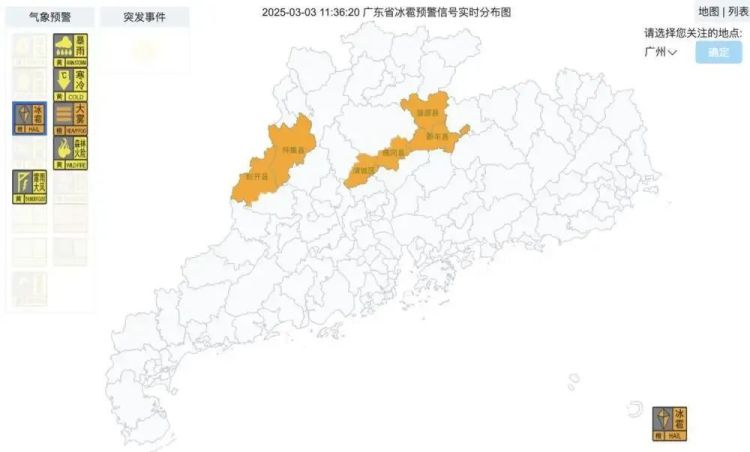截至3月3日11时36分广东冰雹预警信号发布情况 广东气象网截图