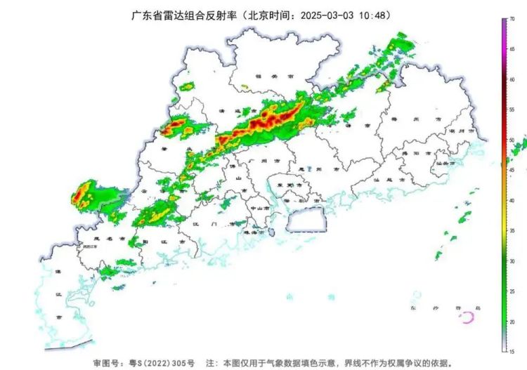 3月3日10时48分的广东气象雷达拼图,可见广东多地已出现明显降水。图/广州天气网供图