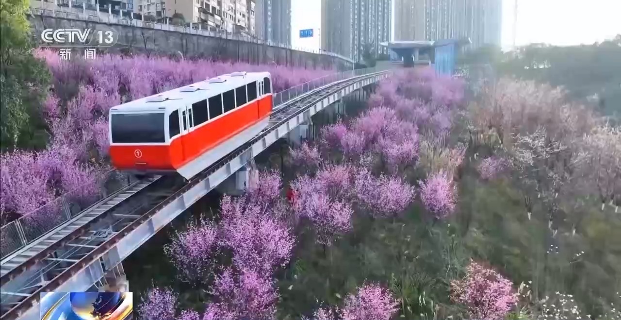 随着春意渐浓,不少人都选择外出赏花,感受春天的美好。在重庆市礼嘉智慧公园内,“时光缆车”穿梭在一片粉色花海中。缆车的轨道建在一片梅林之上,游客乘车驶出站台后,不仅可以欣赏盛开的梅花,还可以远眺嘉陵江的壮丽景色。