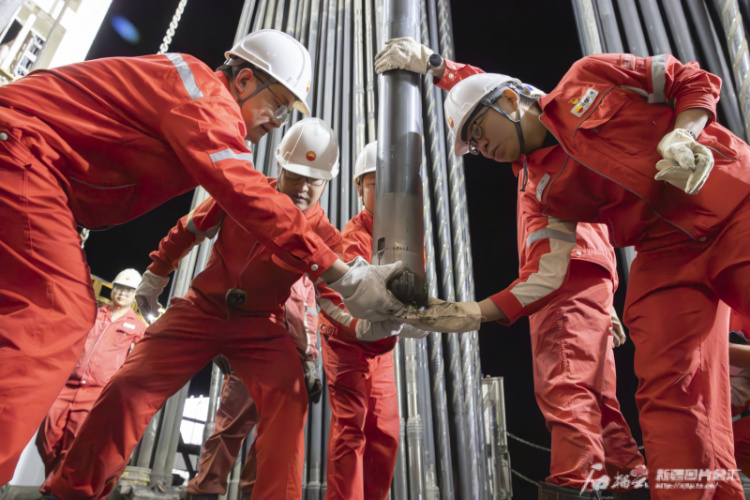 深地塔科1井钻探作业工作人员从井底提出钻头。图/中国石油集团提供