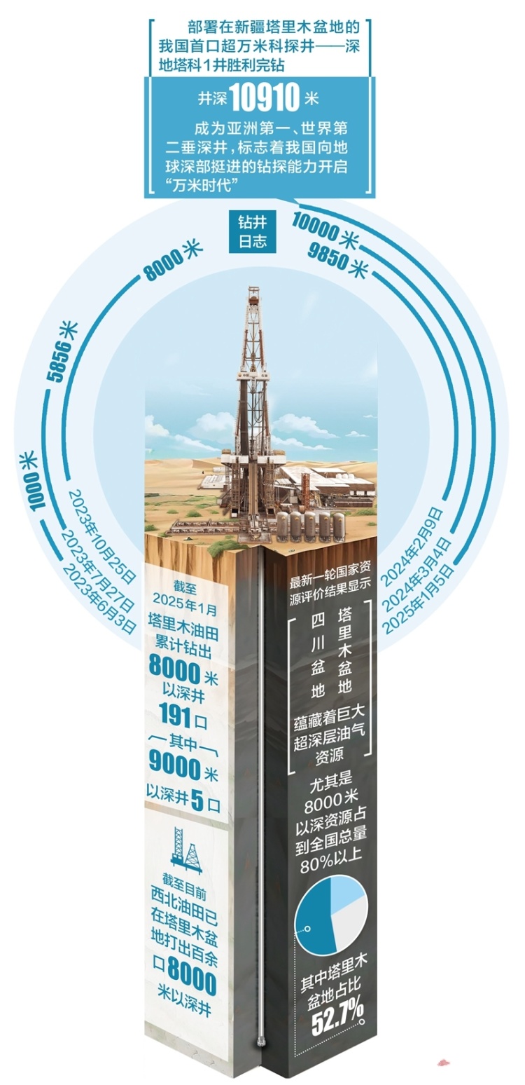 2月20日,中国石油宣布:部署在新疆塔里木盆地的我国首口超万米科探井——深地塔科1井胜利完钻,井深10910米,成为亚洲第一、世界第二垂深井,标志着我国向地球深部挺进的钻探能力开启“万米时代”。