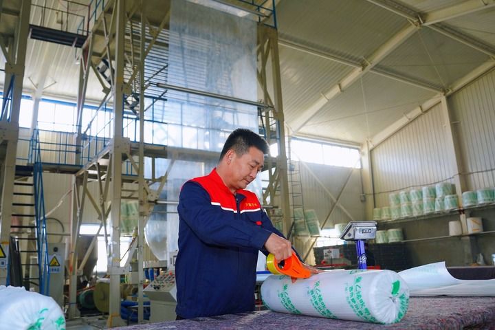 在新疆吉木萨尔县,工人在切割、封装生产下线的地膜。