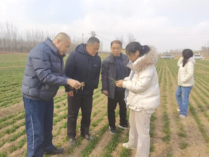 山东省夏津县农业农村局植物保护站站长、高级农艺师郑曰英(右二)正在开展小麦苗情调查、病虫害监测,并指导粮农加强春季田管。