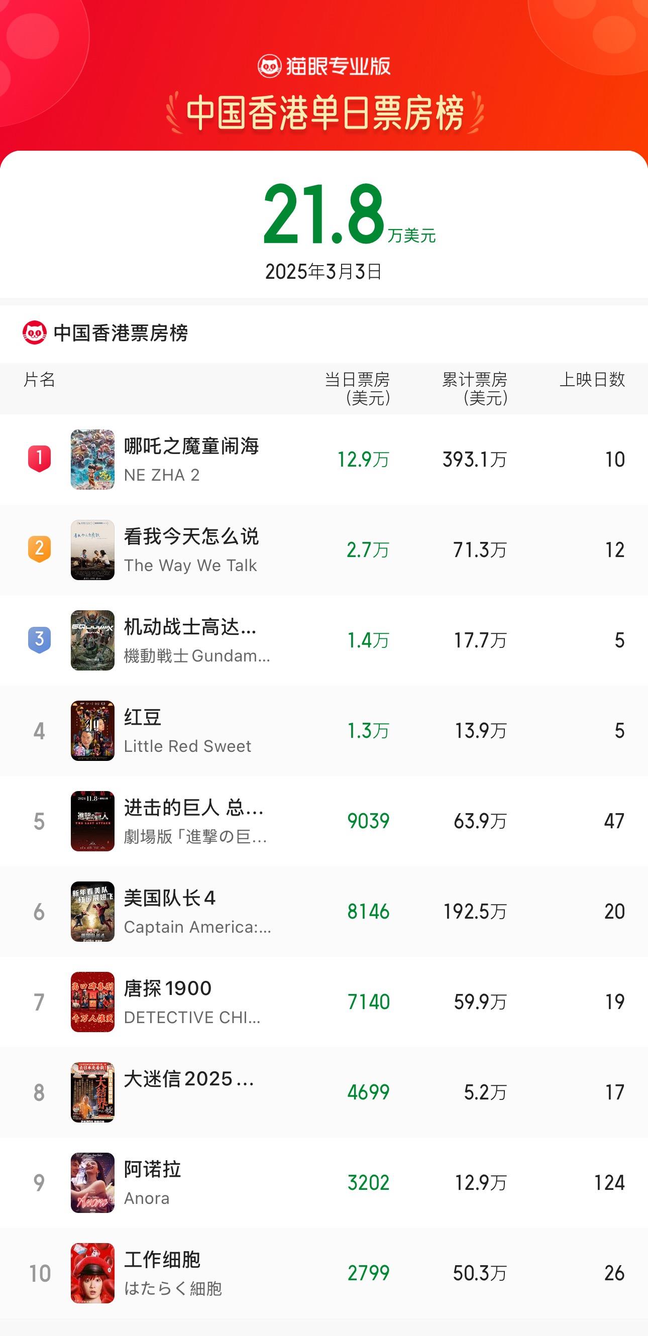 据网络平台数据显示,电影《哪吒之魔童闹海》中国香港上映10天,连续10天登顶中国香港单日票房榜,截至当前中国香港累计票房已超393.1万美元,成为中国香港及澳门影史内地电影票房冠军。(总台央视记者 许盼盼)