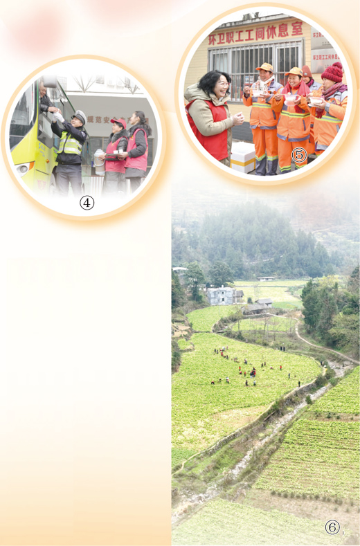 图⑤:河北石家庄鹿泉区,志愿者为环卫工送来元宵等食品。