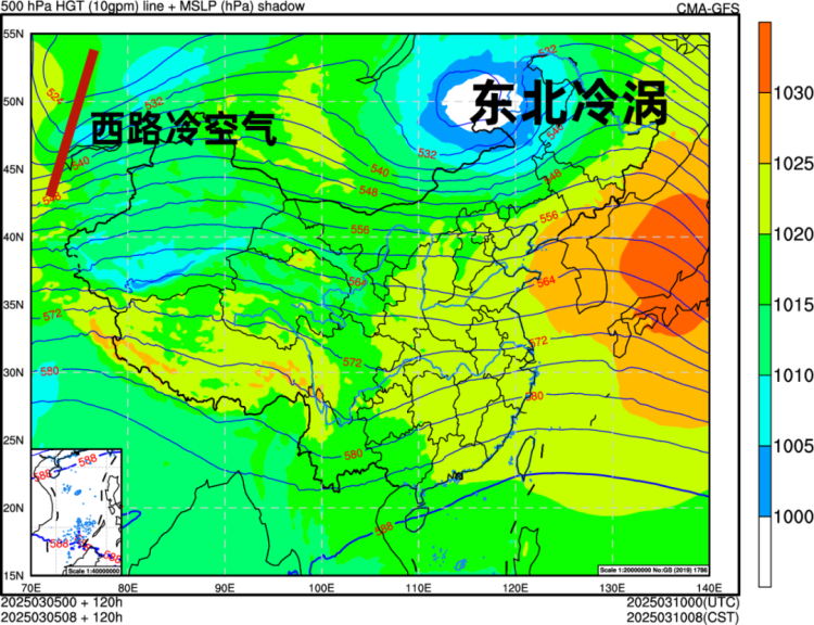 从下图中我们可以看出,东路冷空气的出发点已经是直接出现在了鄂霍次克海的北部沿海海域一带,距离我国东北境内已经是非常接近了,所以由此形成的大风将会得到明显增强。