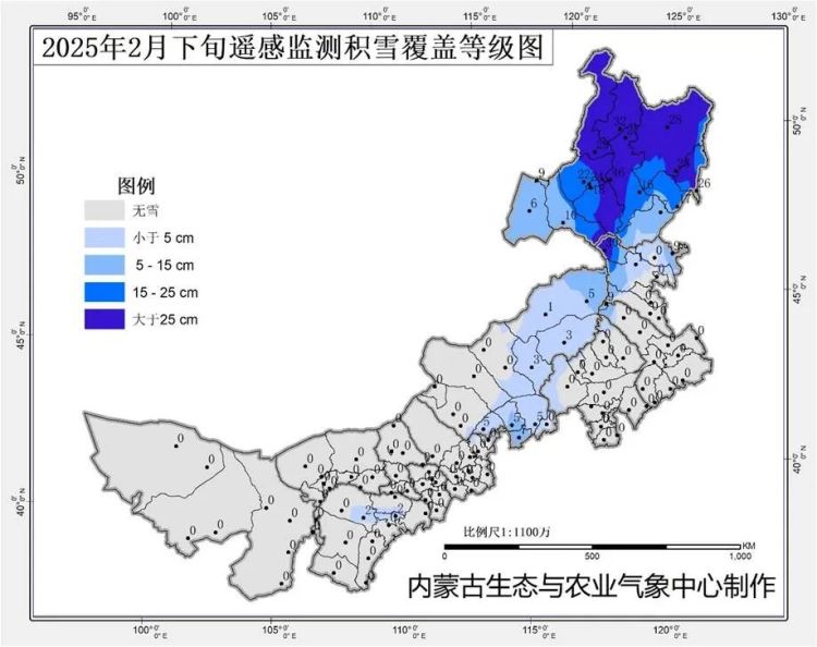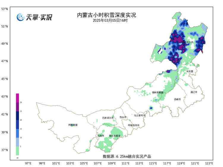 据内蒙古气象部门最新观测数据显示,目前我区主要在呼伦贝尔市、兴安盟北部、通辽市北部局地、赤峰市局部、锡林郭勒盟大部、鄂尔多斯市局部地区有积雪覆盖,面积约为43.51万平方千米,约占全区总面积的36.78%,积雪最深处为46厘米,出现在呼伦贝尔牙克石市。