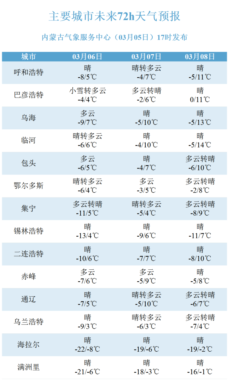 我区西部偏东、中部偏南和偏东、东北部地区多云,鄂尔多斯市中东部、呼和浩特市东北部和南部、乌兰察布市中部和南部、锡林郭勒盟西南部和东北部、兴安盟西部、呼伦贝尔市北部和东部部分地区有分散性小雪或雨夹雪,其余地区晴间多云;西部偏东、中部偏西地区4、5级短时6级偏西风。
