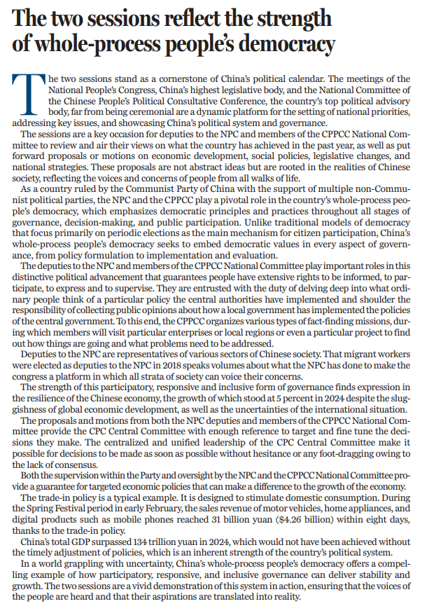 在全球充满不确定性的背景下,中国全过程人民民主展现出强大的治理效能,既保持国家稳定,又推动经济发展。两会的召开正是这一制度优势的生动实践,确保人民的声音得到充分表达,使人民的愿望最终转化为国家发展的现实动力。
