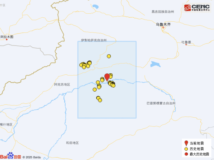 历史地震:根据中国地震台网速报目录,震中周边200公里内近5年来发生3级以上地震共490次,最大地震是2023年1月30日在新疆阿克苏地区沙雅县发生的6.1级地震(距离本次震中177公里),按震级大小前50次历史地震分布如图。