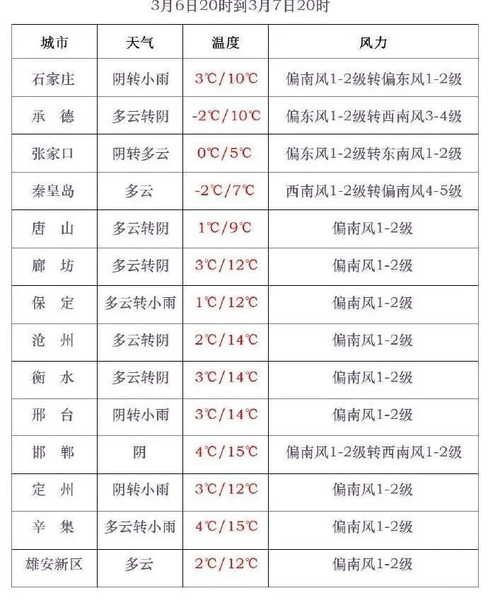 今天夜间到8日,唐山南部、秦皇岛、廊坊南部、沧州、衡水、邢台东部、邯郸东部阴有小雨或零星雨夹雪转晴,其他地区多云转晴。