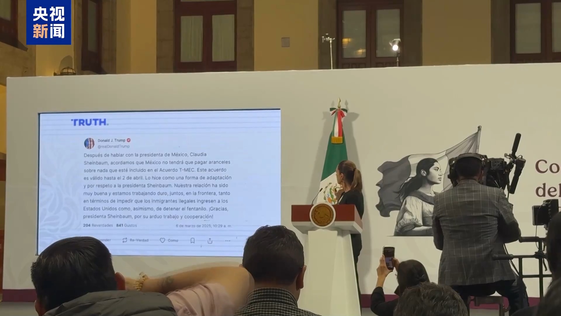 总台记者盛嘉迪:与此同时,辛鲍姆提出“墨西哥计划”,推动本土生产和消费,以提升能源安全和粮食供应保障。她呼吁民众3月9日前往宪法广场参加集会,并将在会上进一步宣布关税政策。