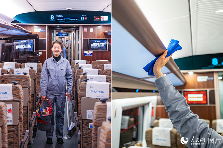 今年31岁的徐丹丹是中国铁路上海局集团公司下属华铁旅服公司的一名列车保洁员,从事高铁清洁工作9年。每当夜幕降临,列车缓缓入库“休整”,徐丹丹和同事们便迅速投身忙碌的工作之中。无论是日常还是春运高峰,从清洁车窗玻璃到擦拭小桌板,车内的每一处细节,她们都仔细清洁。正是因为有着许许多多像徐丹丹这样“高铁美容师”的默默付出,每一列高铁列车才能以窗明几净、整洁舒适的最佳状态,迎接五湖四海的旅客。