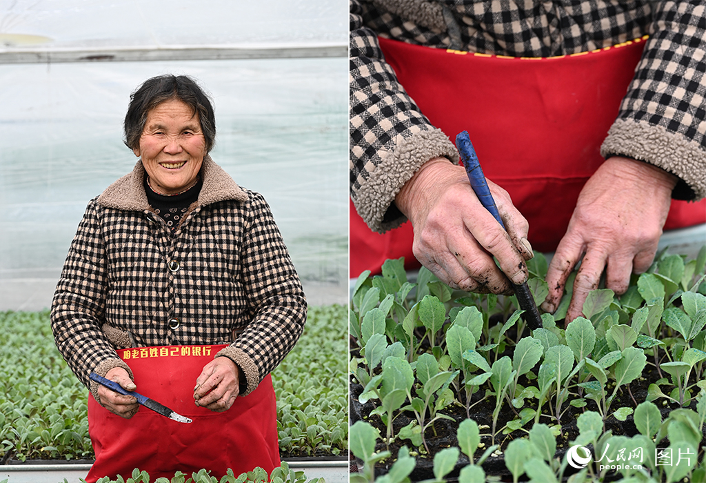 侯小专正在给嫩绿的花菜种苗精心间苗。人民网记者 王玉兴摄