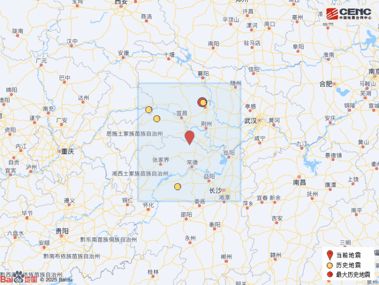 历史地震:根据中国地震台网速报目录,震中周边200公里内近5年来发生3级以上地震共6次,最大地震是2021年7月4日在湖北荆门市东宝区发生的3.5级地震(距离本次震中150公里),历史地震分布如图。