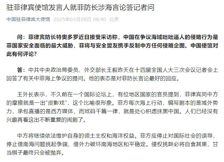 问:菲律宾防长特奥多罗近日接受采访称,中国在争议海域咄咄逼人的侵略行为是菲国家安全面临的最大威胁,菲将与安全盟友携手反制中方任何侵略企图。中国使馆对此有何评论?