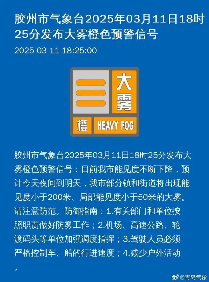 大雾橙色预警信号