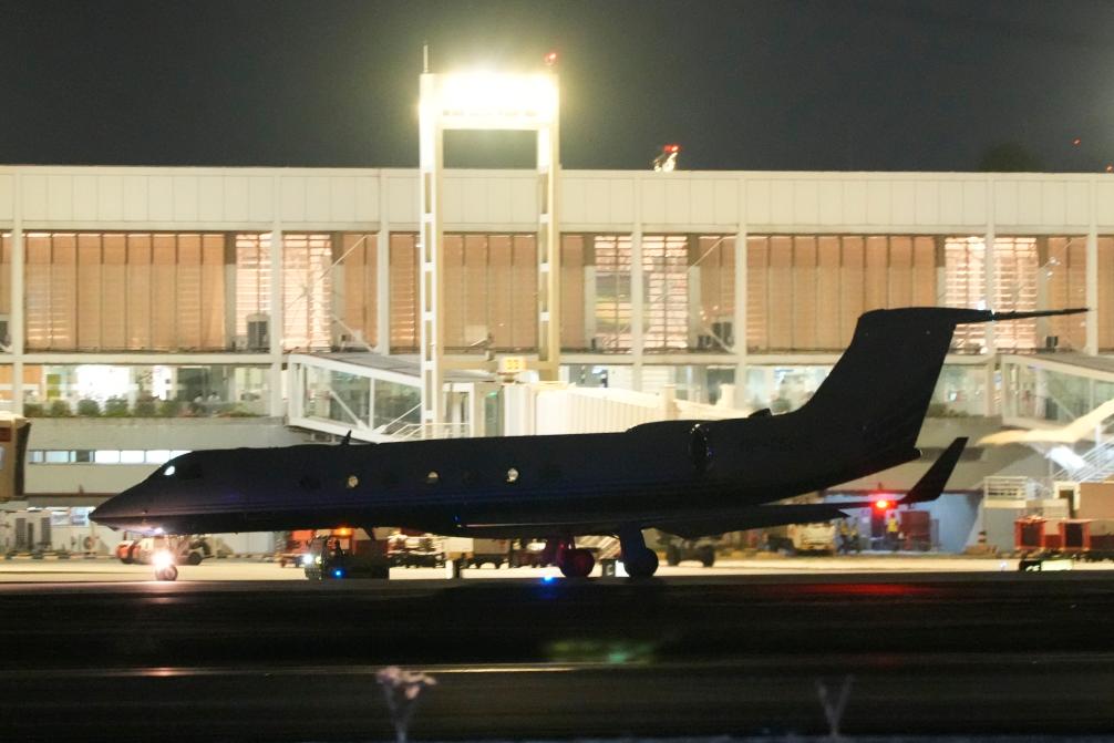 这是3月11日在菲律宾马尼拉比利亚莫尔空军基地拍摄的载有菲律宾前总统杜特尔特的飞机。新华社/美联