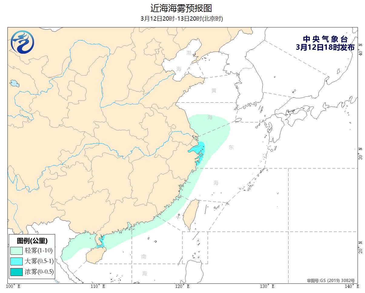3月12日02时至14时,黄海大部海域、东海西北部海域出现了能见度不足1公里的大雾。