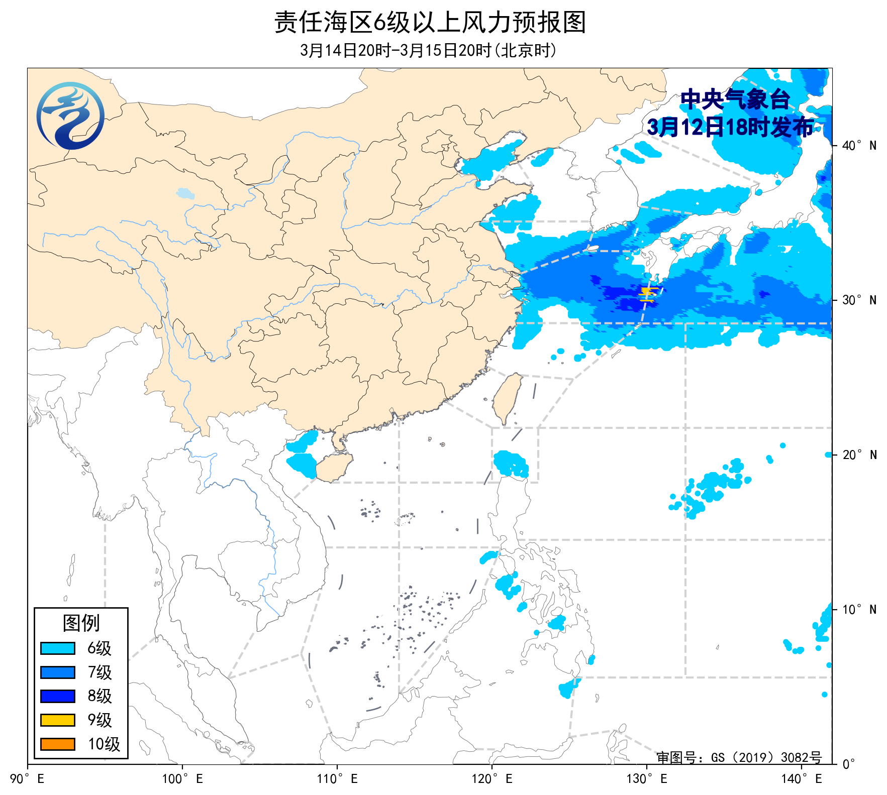 14日20时至15日20时,东海北部海域将有6~7级、阵风8级的偏东风,东海南部海域将有5~6级、阵风7级的西南风,巴士海峡将有4~6级、阵风7级的东南风,渤海、黄海中部和南部海域将有4~6级、阵风7级的偏北到东北风。