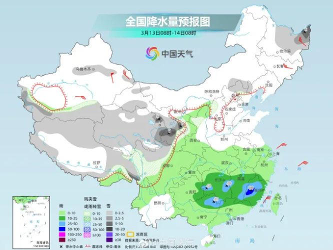 同时,今天起至周末,南方将有明显降雨过程,江南、华南多地或遭暴雨侵袭。