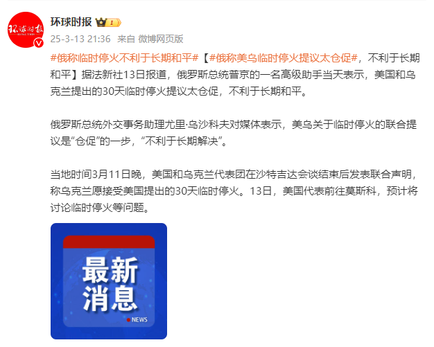 据法新社13日报道,俄罗斯总统普京的一名高级助手当天表示,美国和乌克兰提出的30天临时停火提议太仓促,不利于长期和平。