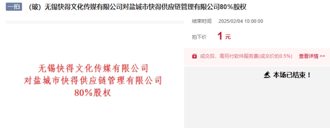 而无锡快得文化传媒有限公司于2024年涉及拖欠工资等三起执行案件,共计6.3万余元,因未能执行到位,于2024年6月被法院裁定受理破产清算,其破产财产处置中涉及到了对盐城市快得供应链管理有限公司的股权处置。