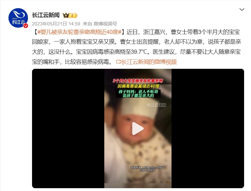 浙江的曹女士带着3个月大的宝宝回娘家,一家人抱着宝宝又亲又摸。曹女士出言提醒,老人却不以为意,说孩子都是亲大的。当天,宝宝因病毒感染高烧至39.7℃。就医后,孩子被诊断为病毒感染。