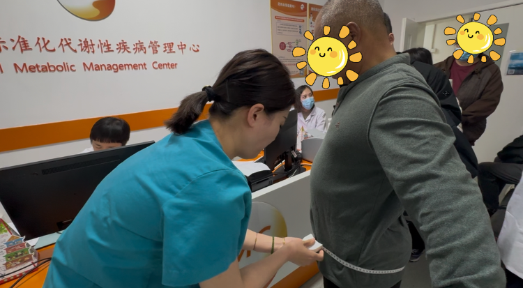 山东大学第二医院肥胖与代谢综合征门诊医生为患者测量腰围、臀围。