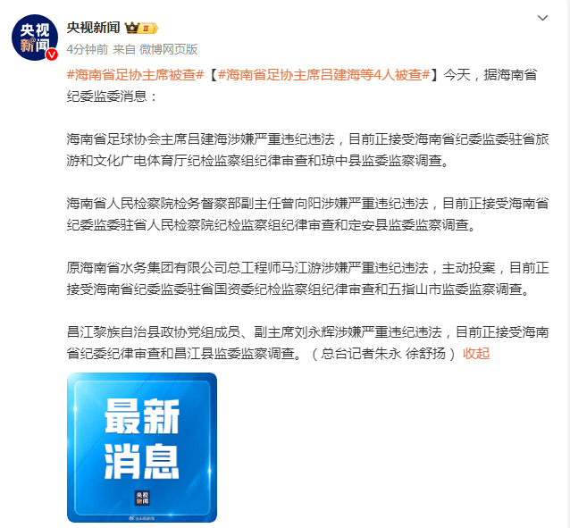 海南省足球协会主席吕建海涉嫌严重违纪违法,目前正接受海南省纪委监委驻省旅游和文化广电体育厅纪检监察组纪律审查和琼中县监委监察调查。