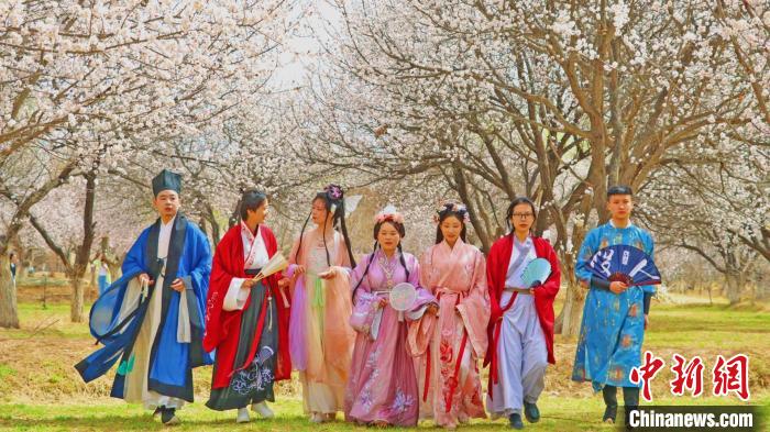 库车杏花绽放,游人身着古装漫步杏园。(资料图)库车市融媒体中心供图