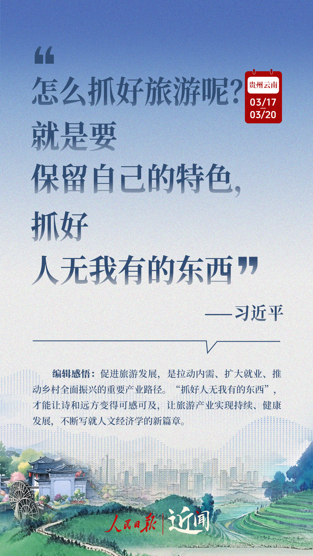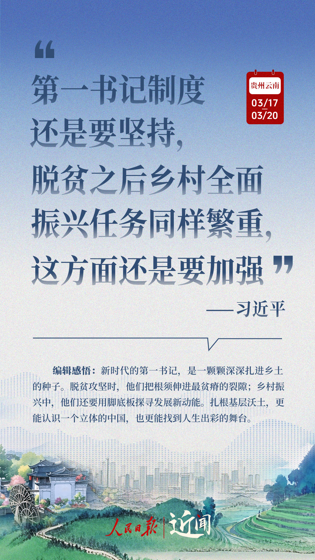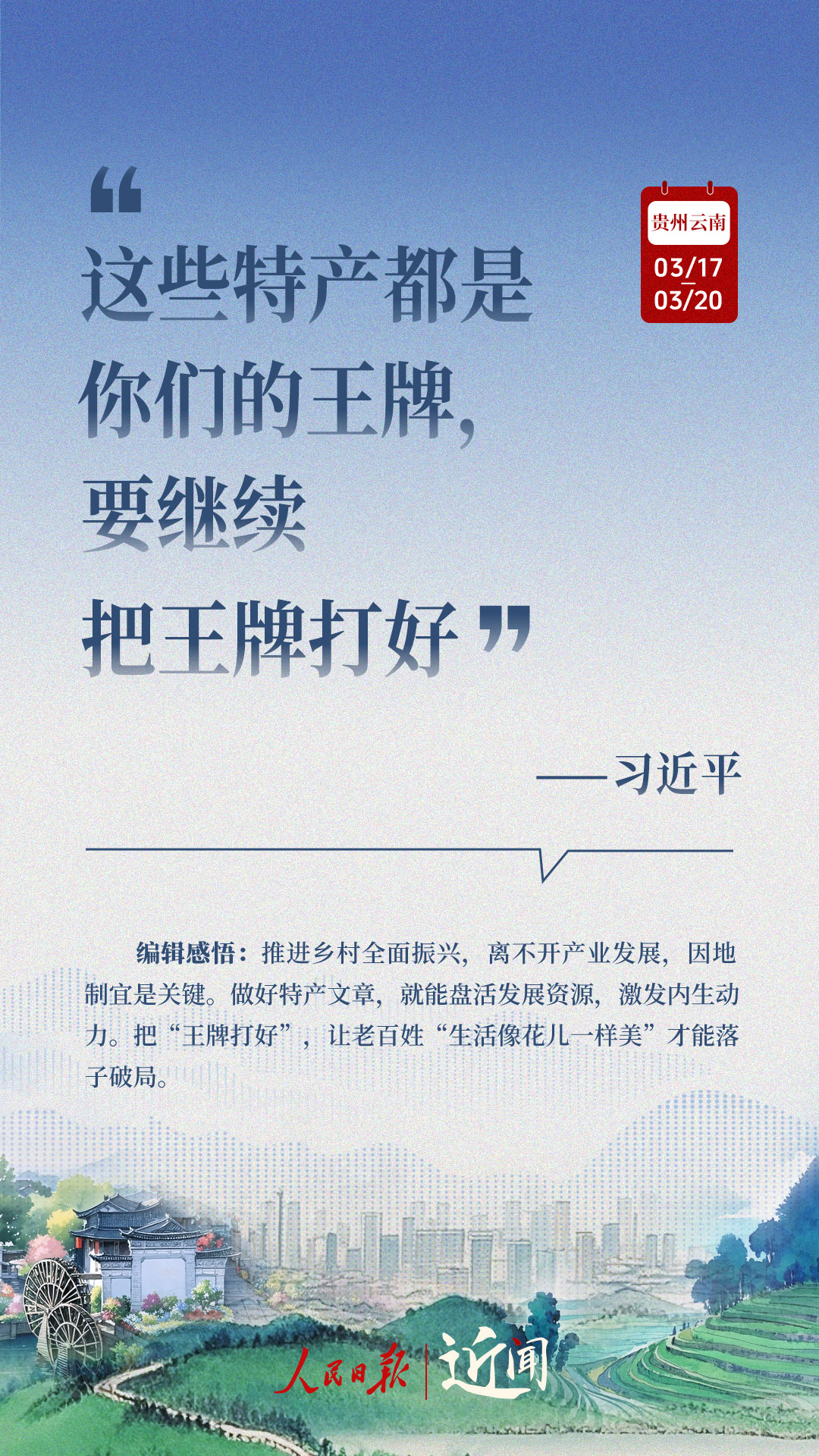 全国两会闭幕不到一周,习近平总书记即赴贵州和云南考察。细致察看,深入询问,一路调研,一路思考。从这十句话,感悟总书记对“国之大者”的深谋远虑,对高质量发展的擘画部署。策划:杜尚泽编辑:胡泽曦海报设计:李艳校检:吴玥