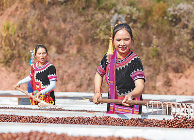 咖农在翻晒咖啡豆。