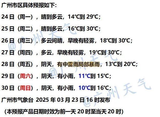 广州市气象台预计,未来三天广州总体维持天晴干燥,气温逐日缓慢上升,周二周三最高气温可达30℃,但昼夜温差大,早晚清凉。3月28日起,受高空槽、切变线和冷空气影响,广州有中雷雨局部暴雨,气温明显下降。眼看夏天就快来到,这一轮降温将让广州入夏进程推迟。