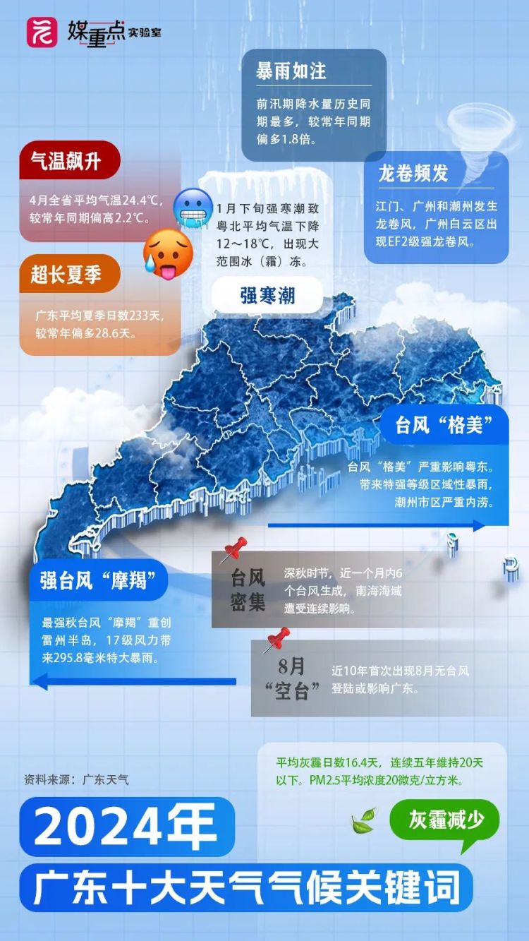 3月20日,广东省气象局发布2024年广东十大天气气候事件。广州日报传媒重点实验室据此归纳为十大关键词,去年天气气候有何特点?今年天气气候又将如何?一起来看↓