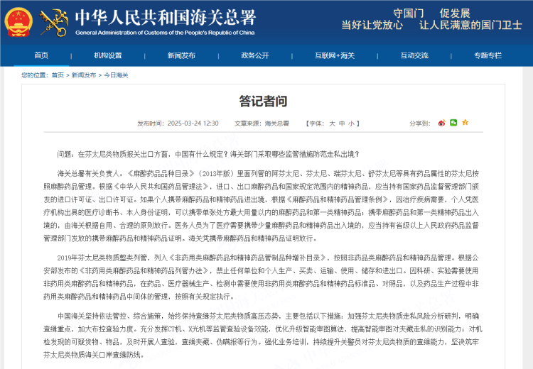 问题:在芬太尼类物质报关出口方面,中国有什么规定?海关部门采取哪些监管措施防范走私出境?