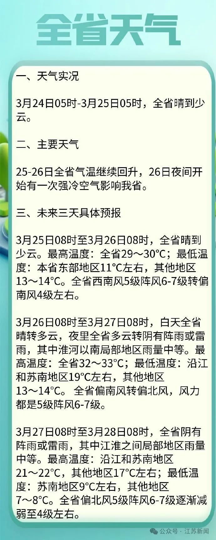 江苏气象:25-26日全省气温继续回升,26日夜间开始有一次强冷空气影响江苏。
