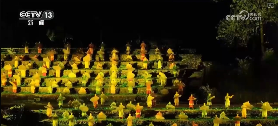 夜幕降临,山水实景演出《印象大红袍》精彩上演,让观众在武夷山山水间了解武夷岩茶制作技艺,感受茶文化魅力。