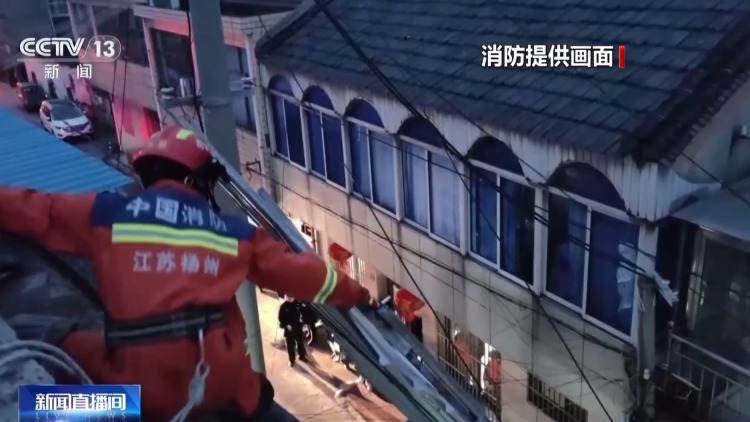 在江苏扬州,一高层楼顶堆放的太阳能板、铁皮等杂物被强风吹散至楼顶边缘,部分铁皮被吹落,悬挂于电线之间,随时有坠落危险。消防救援人员到场后,立即利用爬梯向上攀爬,将坠落的铁皮取回并进行加固。