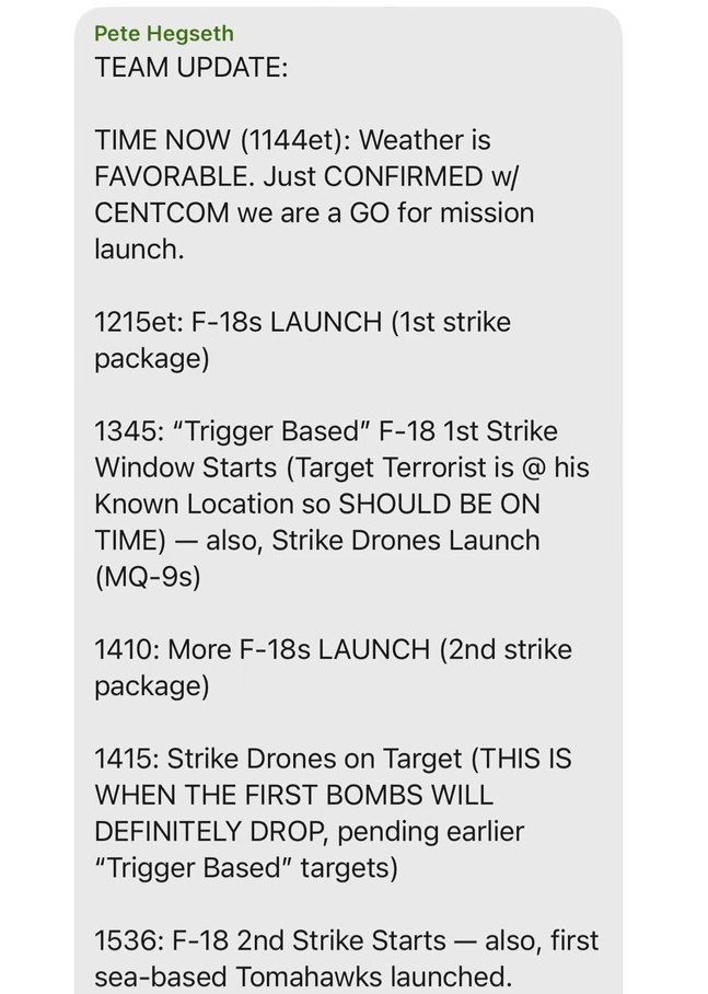 戈德堡及其同事在26日发布的文章中完整公布了这段信息。文章说,赫格塞思于美国东部时间15日11时44分在群聊中发布更新信息,称“天气状况有利。刚刚与中央指挥部确认,我们可以启动任务”。文章还公开了赫格塞思在信息中列出的具体行动时间表。
