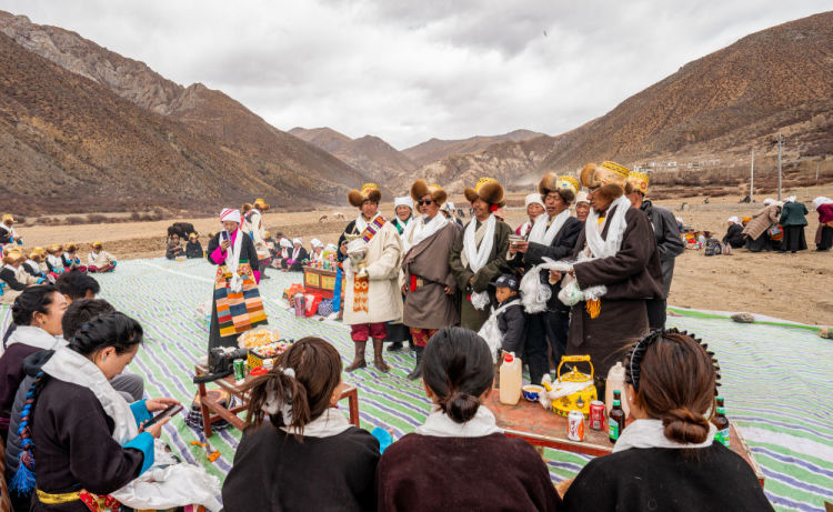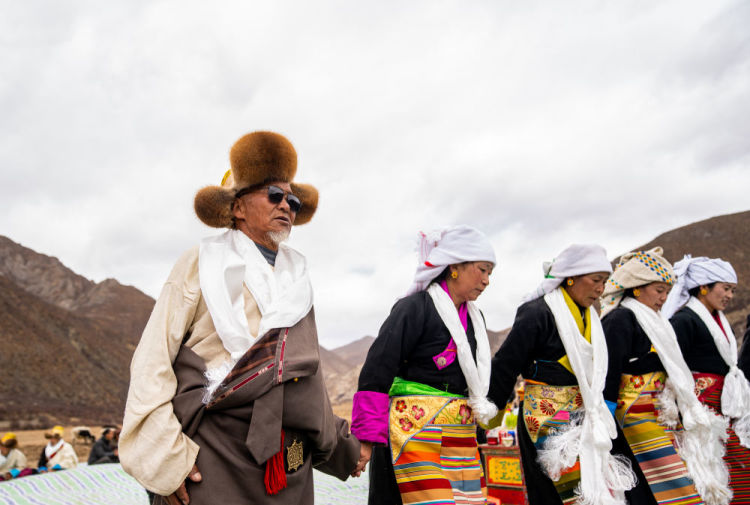 旺庆老人(前排带墨镜者)在春耕大典上为客人敬酒献唱(3月16日摄)。