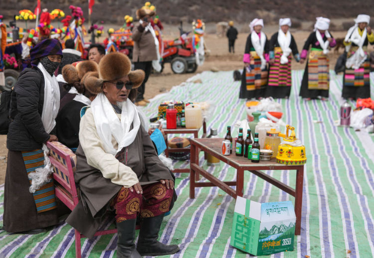 旺庆老人(前)在春耕大典上看着年轻人跳舞(3月16日摄)。