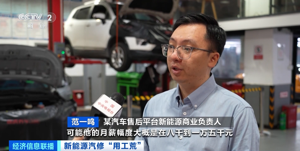 某汽车售后平台新能源商业负责人 范一鸣:过去我们燃油车技工普遍月薪在五千元到一万元,我们新能源车的技工可能月薪幅度大概是在八千元到一万五千元,尤其一些一线城市已经达到了两万元。