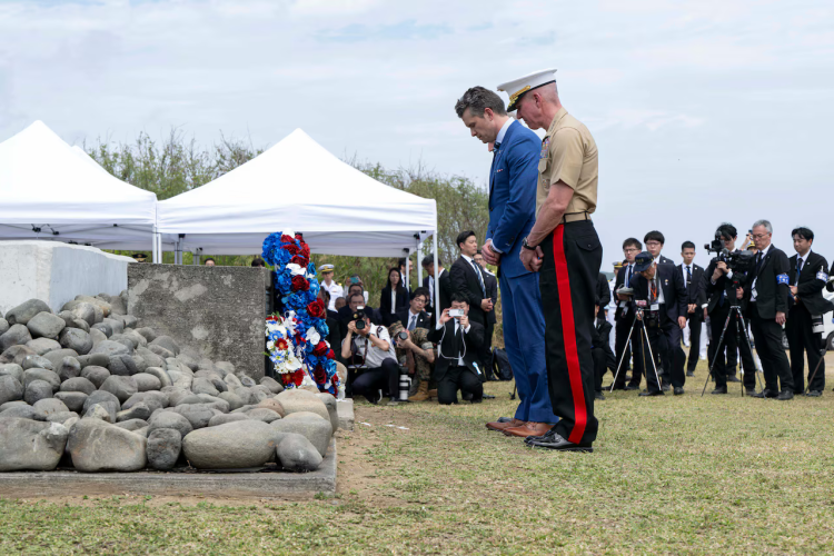 当日,赫格塞思与日本防卫大臣中谷元共同主持了悼念仪式。日本首相石破茂、部分美国老兵、日本遗族及其他官员也一同出席。