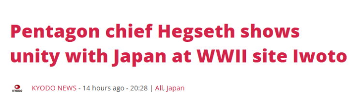 外媒报道:赫格塞思在参加硫磺岛战役纪念仪式上,誓言要加强与日本的联盟